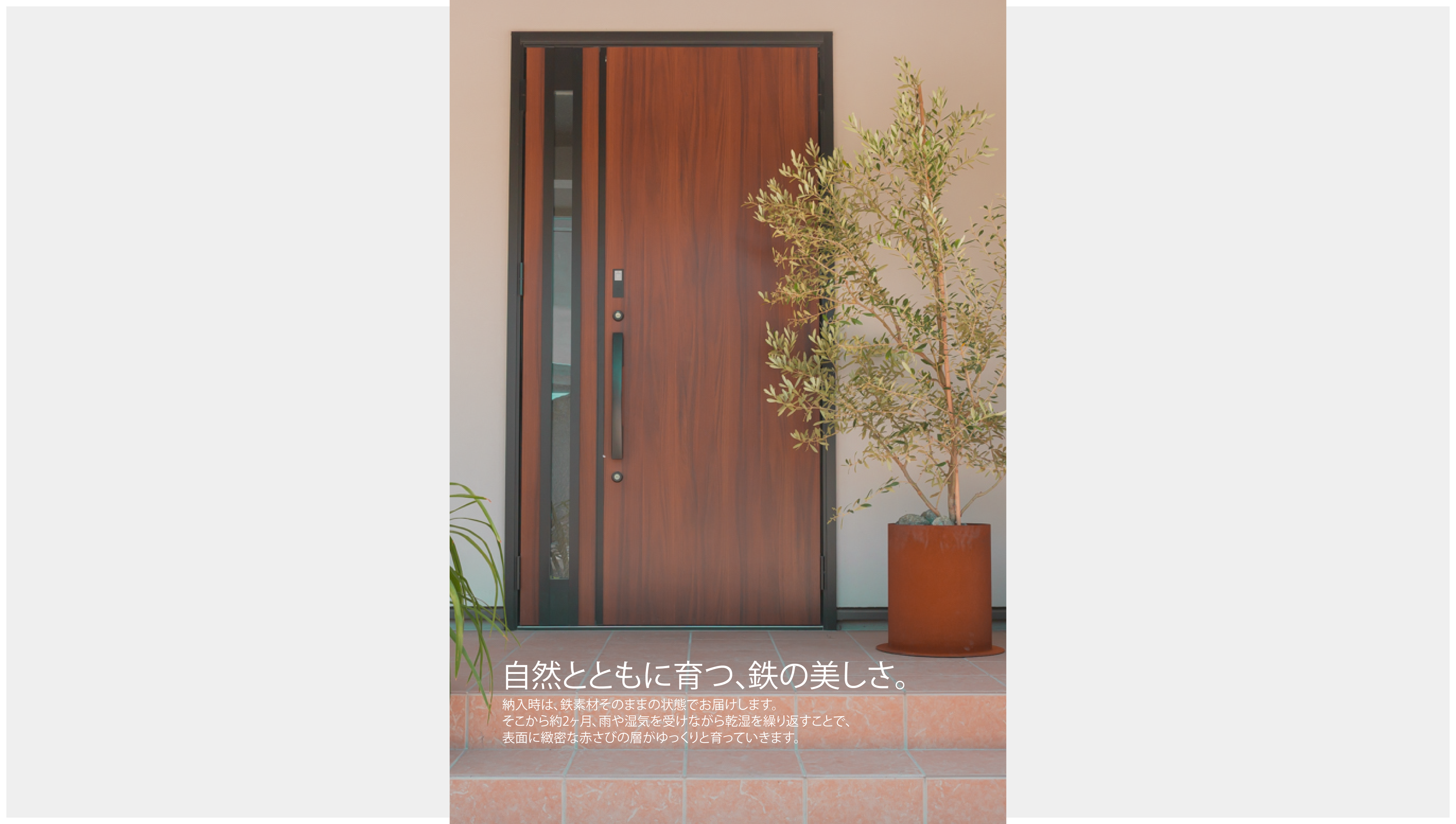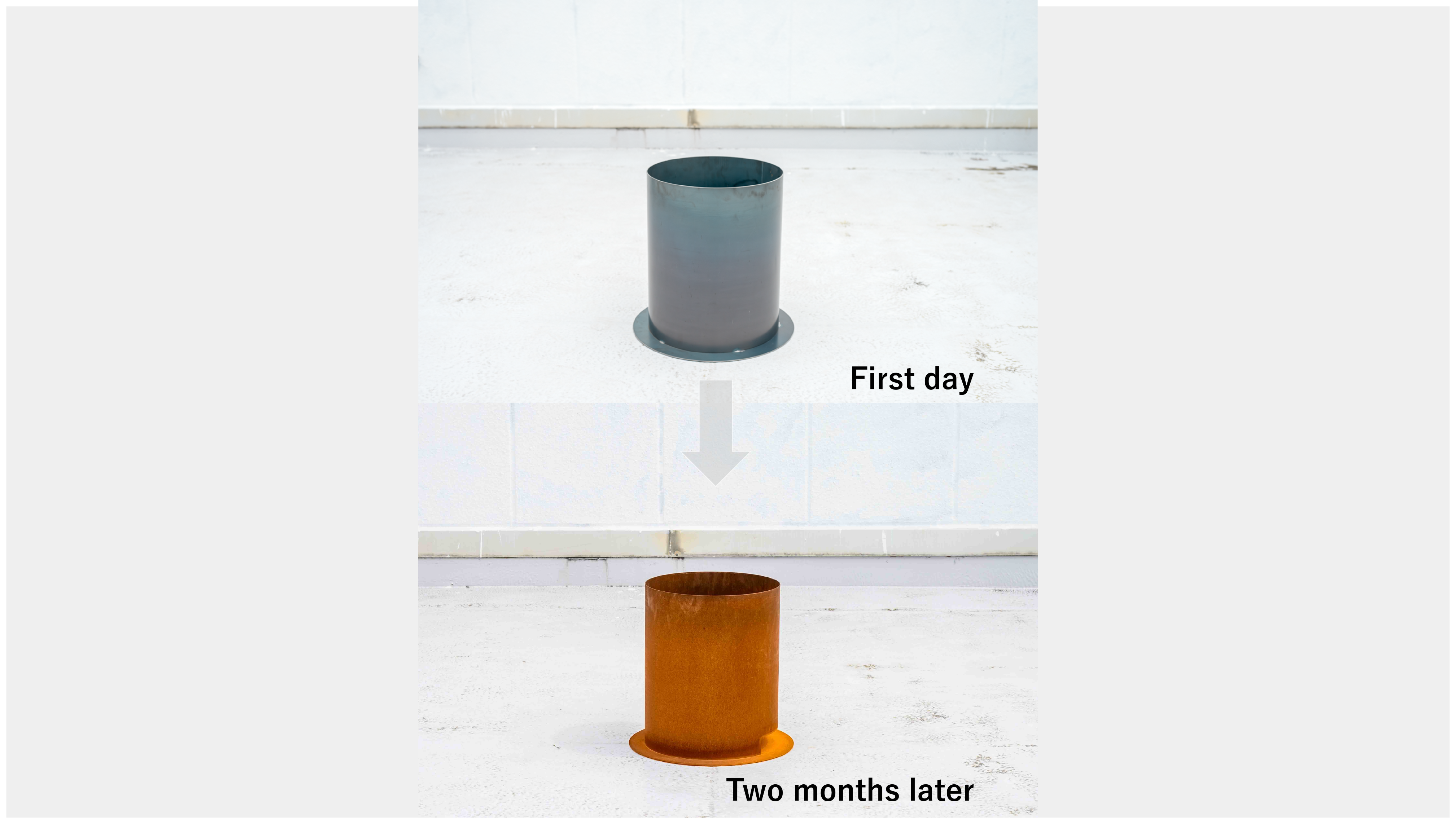 本製品が雨水によって濡れたり乾いたりを繰り返すことで、表面の皮膜が徐々に剥がれ、地鉄が酸化して錆が進行していきます。剥がれた部分や割れ目から錆が広がり、時間の経過とともに全体へと馴染んでいきます。